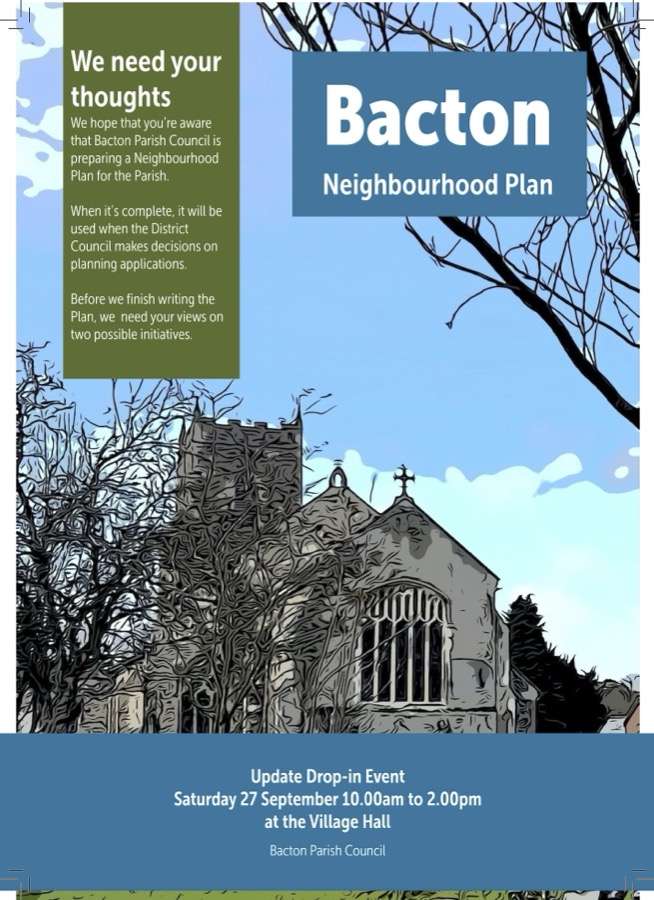 Bacton Parish Council have begun the process of preparing a Neighbourhood Development Plan (NDP). Neighbourhood plans are only concerned with matters that require planning permission and may: